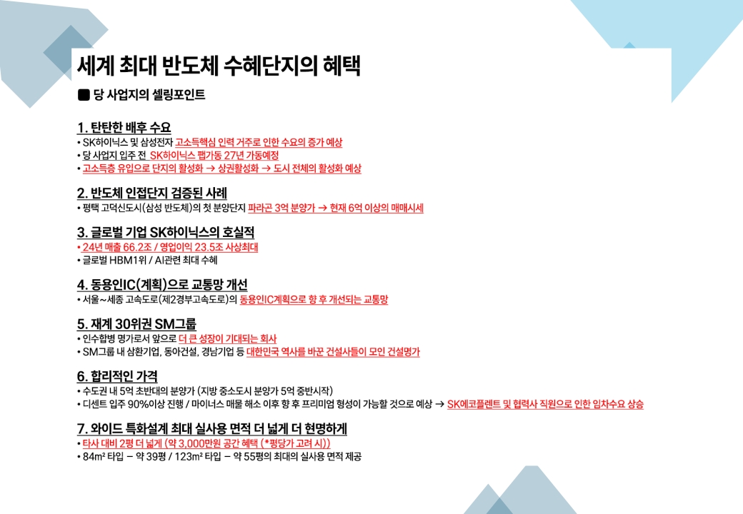 산업 배후 수요: 용인 반도체 클러스터의 장기 조성에 따라 직·간접 주거 수요의 기반이 튼튼합니다.