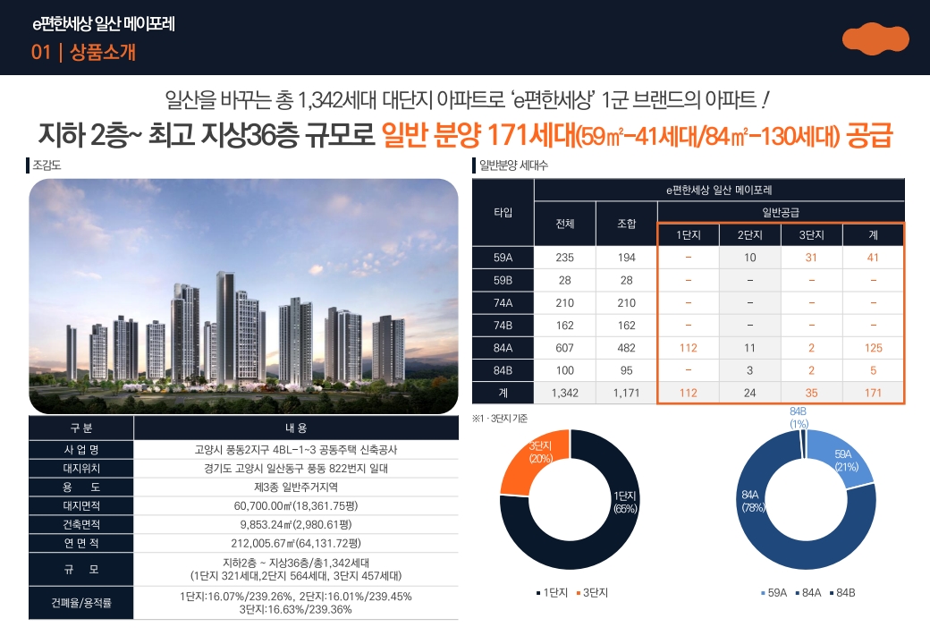 해당 단지는 1~3단지를 합쳐 1,300세대 이상 규모로 구성되며, 전용 59㎡·84㎡ 중심의 실수요형 평면으로 계획되어 있습니다. 시공사는 **DL이앤씨(디엘이앤씨)**이며, e편한세상 브랜드 특유의 주거 품질과 상품 완성도를 그대로 이어갑니다.