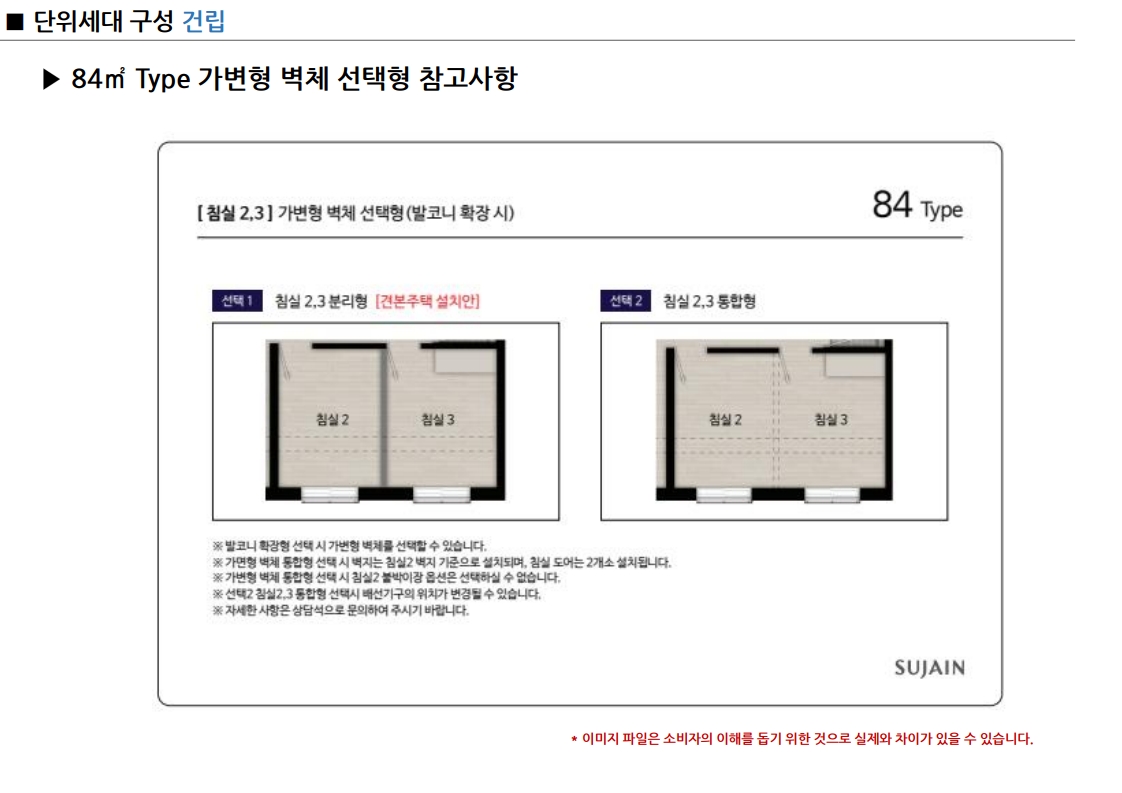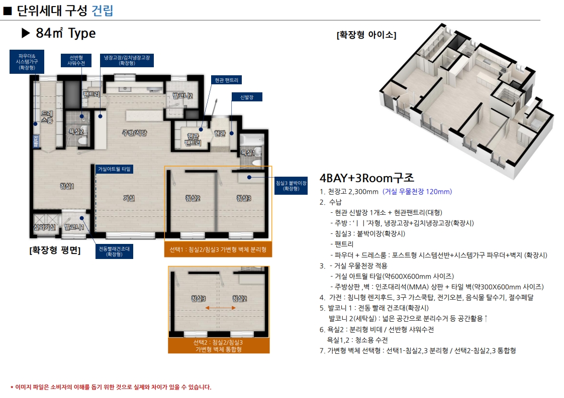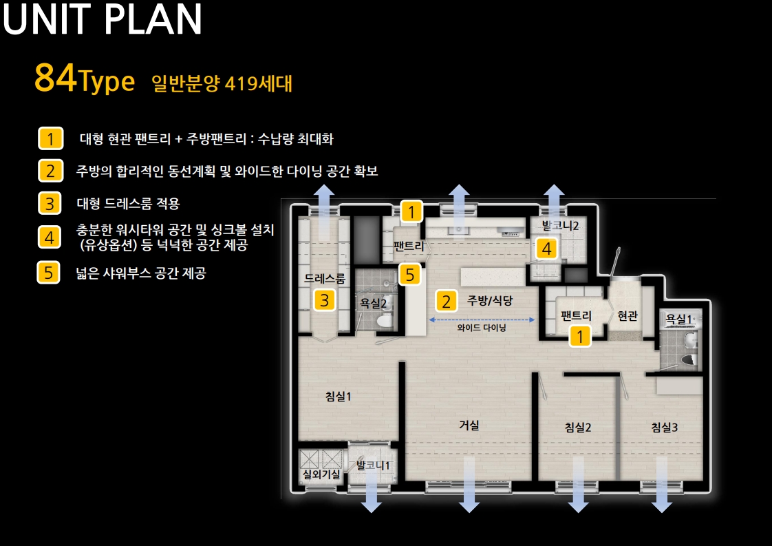 수요가 두터운 전용 84㎡를 주력으로 구성하여, 방·욕실·수납의 균형과 가변형 벽체, 팬트리 등 ‘실사용 면적 체감’을 강화했습니다. 동·라인에 따라 차이가 있으나 판상형 4Bay 위주 설계를 통해 채광·환기·수납 벽면 확보를 도모합니다.