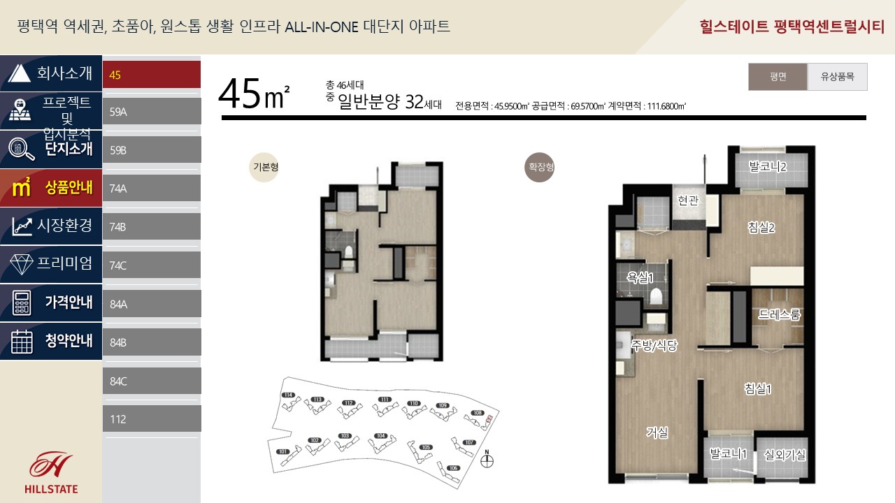 일반분양 599세대는 전용 45㎡부터 112㎡까지 폭넓은 면적으로 구성되어 있습니다. 입주자모집공고를 기준으로 보면 45㎡, 59㎡·, 74㎡··, 84㎡··, 112㎡ 등으로 세분화되어 있으며, 실수요 선호가 높은 중소형 평형 비중이 높게 책정되어 있습니다.