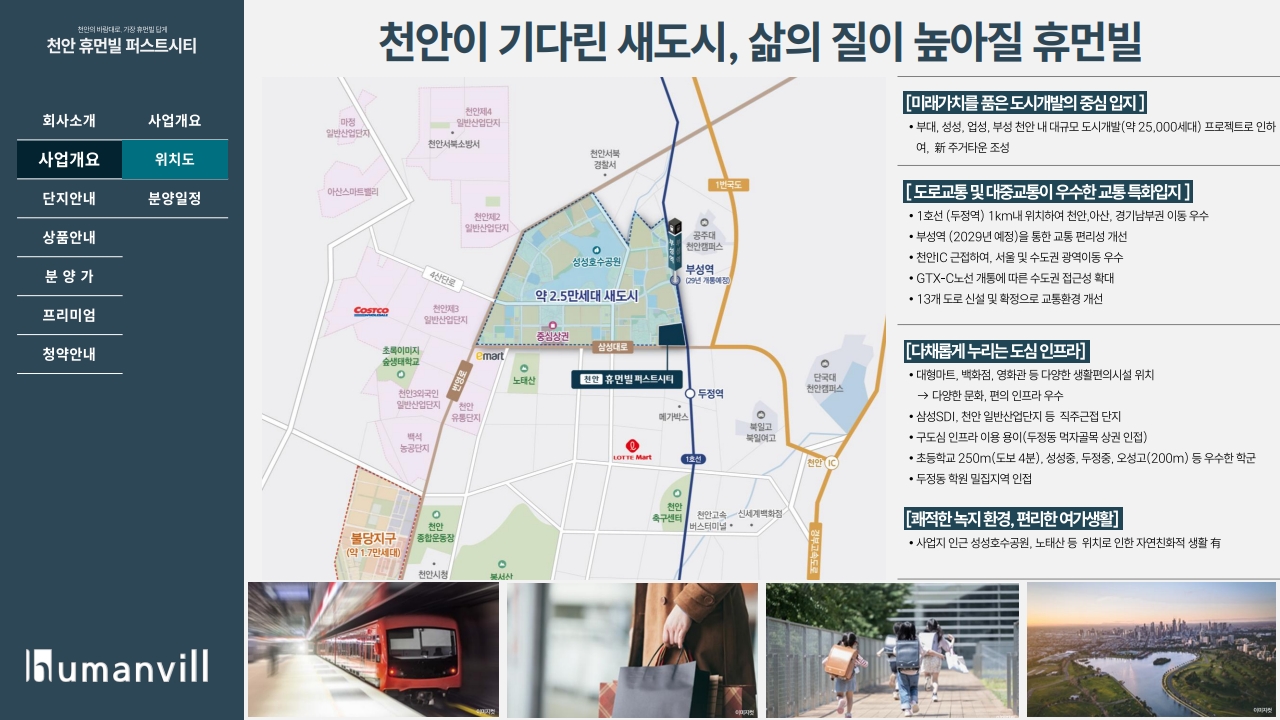 시행사인 일신건영의 휴먼빌 브랜드는 평택, 이천, 여주 등에서 이미 입증된 브랜드입니다. 특히 올해 8월에 입주를 시작한 평택 화양 휴먼빌 퍼스트시티의 경우, 조경과 커뮤니티 시설이 워낙 잘 되어 있어서 인근 타 단지 입주 예정자들까지 구경을 올 정도였다고 하네요. 단지 안에서만 건강하고 여유로운 생활을 즐길 수 있도록 설계했다는 평가를 받았습니다. 이러한 검증된 노하우가 천안에도 그대로 적용된다고 보시면 됩니다.