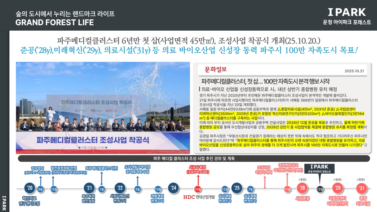 파주시는 올해 4월 경제자유구역 후보지로 선정되며 도시 성장의 기반을 마련했고, 11월에는 파주 경제자유구역 콘퍼런스를 개최해 기업 유치에 적극 나서고 있습니다. 파주메디컬클러스터를 중심으로 바이오헬스 산업이 본격화되면 의료와 연구 인력의 유입이 가속화될 것으로 전망됩니다. 이런 상황에서 직주근접이 가능하고 생활 환경이 탄탄한 대규모 브랜드 단지에 대한 수요는 더욱 확대될 수밖에 없습니다.