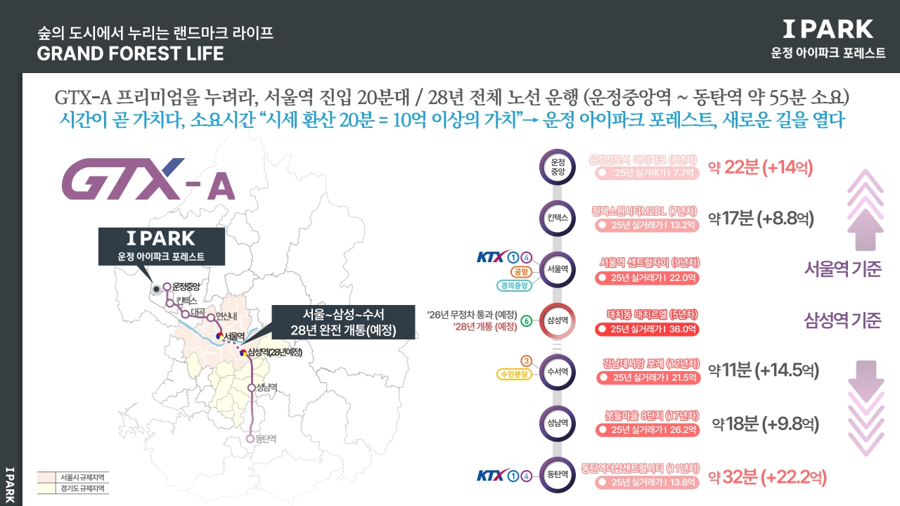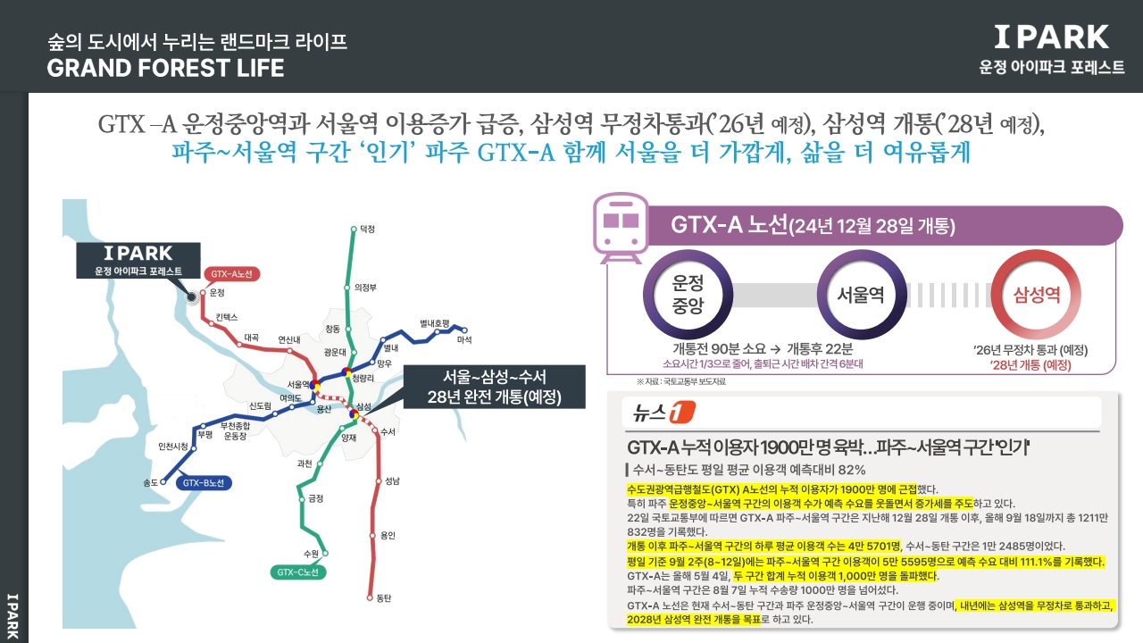 많은 분들이 파주하면 여전히 '너무 멀다'는 선입견을 갖고 계신데, 이건 지난해 말 GTX-A 운정중앙역 개통 전 이야기입니다. 2024년 12월 28일 GTX-A 북부 구간이 개통되면서 파주운정에서 서울역까지 단 21분 만에 도착하게 되었죠. 경의중앙선으로 46분, 광역버스로 1시간 넘게 걸리던 거리가 절반 이하로 줄어든 겁니다.