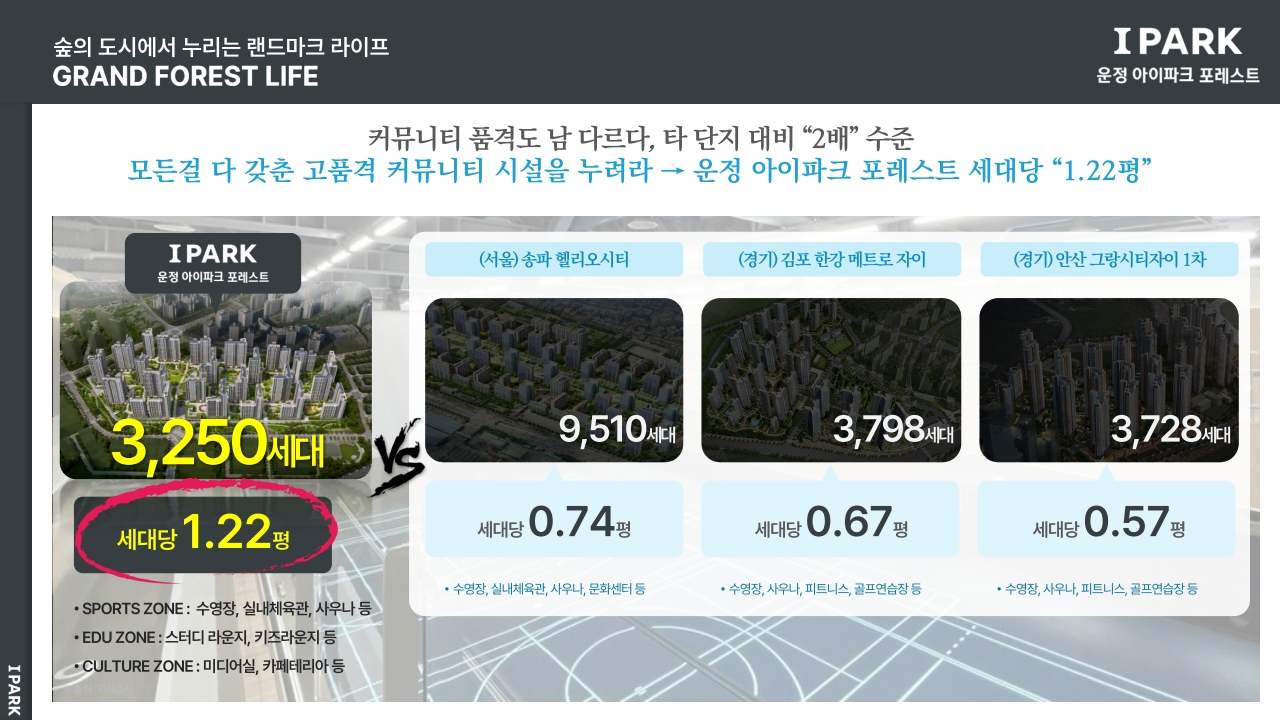 단지명이 처음엔 운정 아이파크 시티였다가 운정 아이파크 포레스트로 변경된 것도 의미가 있습니다. 웰니스 라이프를 강조하기 위한 리뉴얼 전략의 일환인데요,