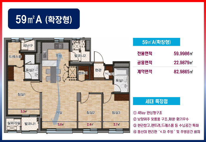 단지는 전용면적 59제곱미터부터 84제곱미터까지 다양한 평형으로 구성되어 있으며, 일부 세대에는 4베이 설계가 적용되어 공간 활용도를 높였습니다. 남향 위주의 판상형 배치로 채광과 통풍이 우수하다는 평가를 받고 있으며, 펜트리룸 등 특화 설계도 적용되었습니다.