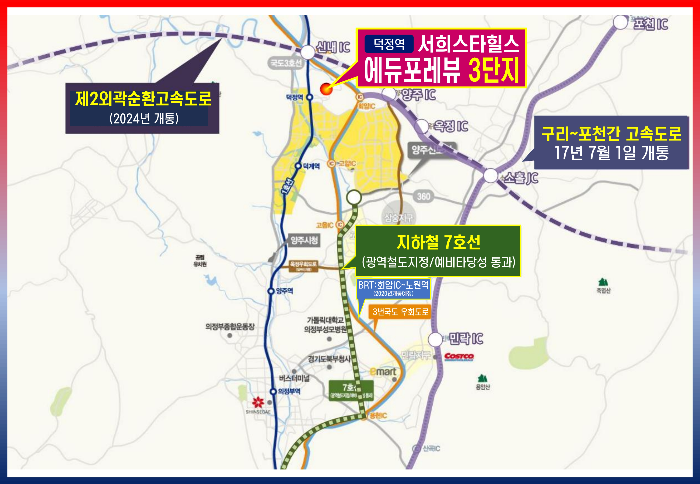 현재 교통 여건도 나쁘지 않습니다. 1호선을 이용하면 청량리역까지 약 40분, 서울역까지 1시간 내 이동이 가능하며, 서울 광역환승센터를 연결하는 G1300번 버스가 덕정역 앞에서 출발하고 있어 직장인들의 출퇴근에 활용 가능합니다. 3번 국도를 이용하면 의정부 및 서울외곽순환고속도로 진입도 용이합니다.