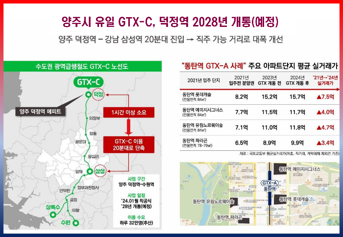 주목할 만한 점은 인근 양주신도시 옥정지구의 개발입니다. 옥정지구는 판교의 1.2배, 위례의 1.7배 규모인 약 700만 제곱미터 면적에 6만3천 가구, 16만여 명이 거주하는 대규모 신도시로 개발되었습니다. 2014년부터 입주가 시작되어 2025년 현재 12개 단지가 입주를 완료한 상태이며, 이러한 배후 수요는 덕정역 인근 지역의 생활 인프라 확충과 지역 가치 상승에 긍정적인 영향을 미치고 있습니다.