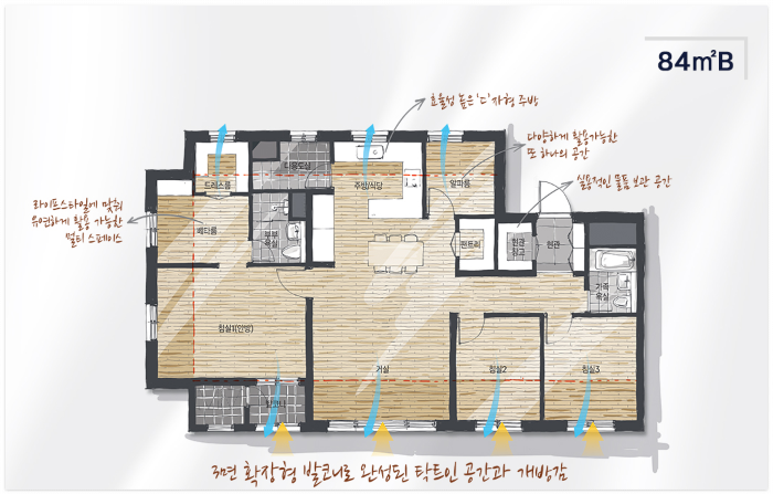 GS건설의 프리미엄 브랜드 자이답게 단지 설계도 탁월합니다. 남향 위주의 배치와 판상형 설계로 채광과 통풍이 뛰어나며, 넓은 동간 거리를 확보해 사생활 보호와 일조량, 조망권을 극대화했습니다. 가구당 1.5대의 넉넉한 주차공간도 갖추고 있어 주차 걱정을 덜 수 있습니다. 각 주택형별로 드레스룸, 팬트리, 알파룸, 베타룸 등 다양한 수납공간을 마련해 공간 활용도도 높였습니다.