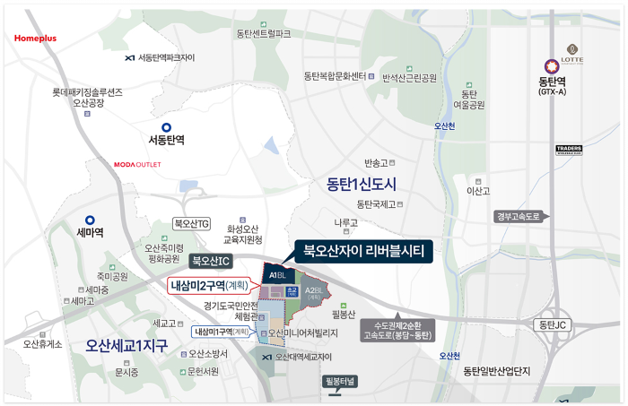 생활 인프라 측면에서는 동탄신도시와 세교지구를 양쪽으로 끼고 있어 정말 편리합니다. 롯데백화점 동탄점, 트레이더스 홀세일클럽 동탄점, 한림대학교동탄성심병원 등 동탄의 우수한 편의시설을 차량으로 5분 거리에서 이용할 수 있고, 이마트 오산점, 롯데마트 오산점, CGV 오산중앙점 등 오산시 내 생활시설도 가깝습니다. 자녀 교육을 중요하게 생각하시는 분들께는 동탄 학원가 접근성이 큰 장점으로 작용할 것입니다. 동탄과 세교 양쪽 생활권의 주거 인프라를 모두 활용할 수 있다는 점은 실거주 만족도를 크게 높여줄 것입니다.