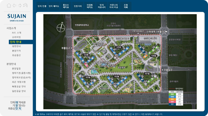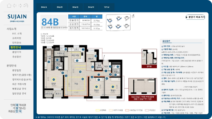 평면별로는 84제곱미터A형 208가구, 84제곱미터B형 513가구, 84제곱미터G형 43가구, 84제곱미터H형 25가구, 그리고 인천 지역에서 보기 드문 101제곱미터 대형 면적이 170가구 공급됩니다.