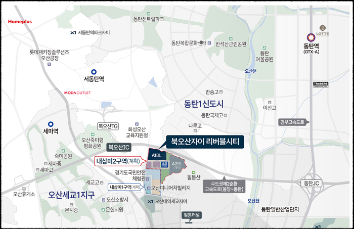 북오산 지역은 오산시 내에서도 특별한 위치를 차지하고 있습니다. 동탄신도시와 세교신도시 사이에 자리잡고 있어 두 신도시의 인프라를 모두 활용할 수 있다는 점이 가장 큰 매력입니다. 실제로 이 단지에서 차량으로 5분이면 동탄신도시에 진입할 수 있어 롯데백화점 동탄점, 트레이더스 동탄점, 한림대학교동탄성심병원 같은 대형 편의시설을 바로 이용할 수 있습니다. 이마트 오산점이나 롯데마트 오산점 같은 오산시 내 시설도 가까운 거리에 있어 생활 편의성이 뛰어납니다.