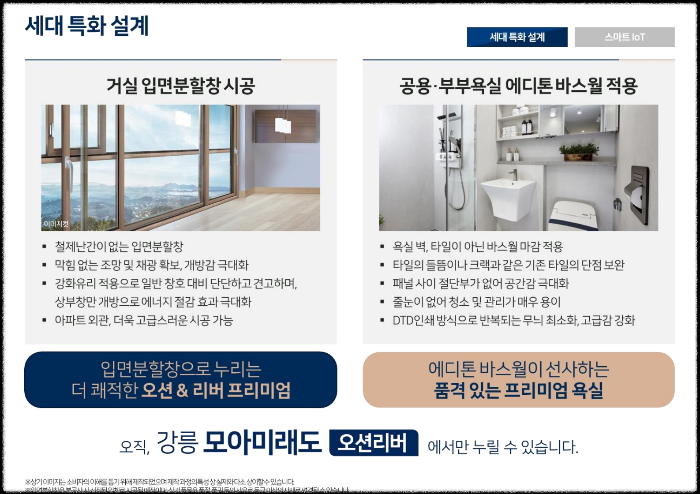 많은 분들이 오해하시는 부분이 하나 있는데, 바다 전망이 나오는 아파트라고 해서 모든 세대가 오션뷰를 누리는 것은 아닙니다. 강릉 모아미래도 오션리버 역시 일부 세대에서만 오션뷰와 리버뷰를 동시에 조망할 수 있으므로, 실제 계약 전에 동호수별 조망권을 꼼꼼히 확인하시는 것이 중요합니다. 각 동의 위치와 향, 층수에 따른 전망 차이를 직접 확인해보시길 권해드립니다.