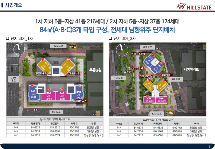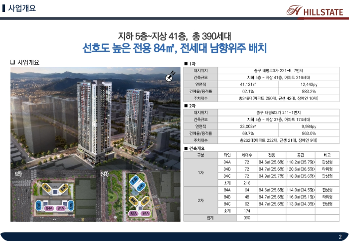 단지는 지하 5층부터 지상 41층까지 총 216세대로 구성되어 있으며, 전용면적 84제곱미터 단일 평형으로 계획되었습니다. 실수요자들이 선호하는 중소형 평형대로, 관리와 활용도 측면에서 효율적인 구조입니다. 단지 내 1층부터 3층까지는 상업시설인 힐스 에비뉴가, 4층은 주민공동시설로 조성되어 입주민들의 편의를 고려한 설계가 돋보입니다.