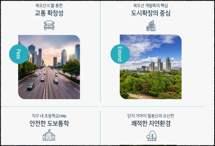 교통 여건부터 살펴보면, 이 단지가 위치한 내삼미2구역은 수도권제2순환고속도로 북오산IC와 매우 가깝습니다. 경부고속도로 진입도 용이해 서울, 수원, 용인 등 수도권 주요 지역으로의 이동이 신속합니다. 지하철 1호선 오산대역도 이용 가능하며, 향후 수인분당선 오산대역 연장과 동탄도시철도, GTX-C 노선 오산 연장 등이 계획되어 있어 교통망은 더욱 확충될 것으로 보입니다. 특히 차량으로 동탄신도시까지 약 5분 거리에 위치해 동탄과 오산의 생활 인프라를 모두 누릴 수 있다는 점이 큰 장점입니다.