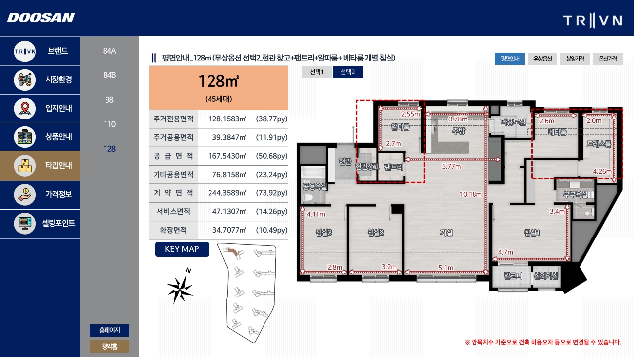 평면 구성을 보면 전용면적 84제곱미터부터 128제곱미터까지 중대형 면적으로만 구성되어 있습니다. 구체적으로는 84제곱미터A형 393가구, 84제곱미터B형 113가구, 98제곱미터 205가구, 110제곱미터 73가구, 128제곱미터 45가구로 이뤄져 있어요. 요즘 소형 평형 위주로 공급되는 추세와는 다르게 중대형으로만 구성했다는 점이 눈에 띕니다. 이는 실거주 목적의 3~4인 가구를 주요 타겟으로 한다는 의미죠. 특히 84제곱미터 타입이 전체 물량의 60% 이상을 차지하는데, 이 면적대가 서산 지역에서 가장 선호도 높은 실수요형 평형이라는 점을 반영한 것으로 보입니다.