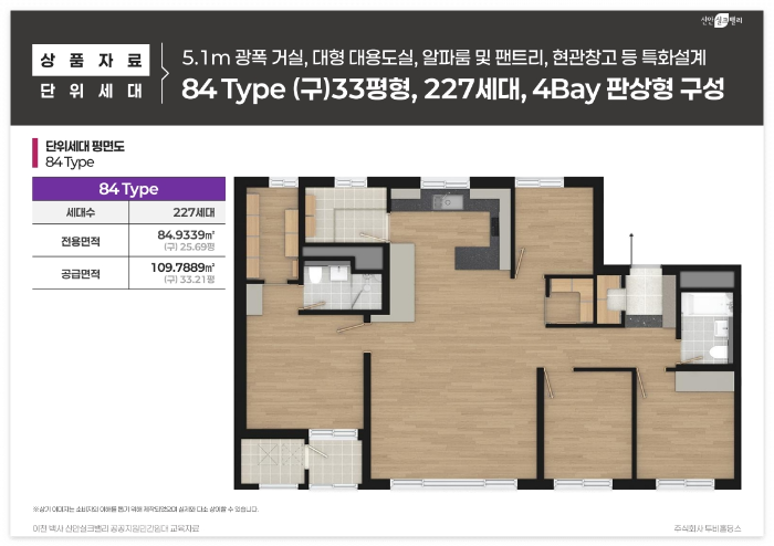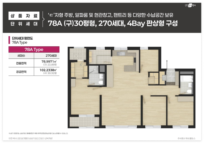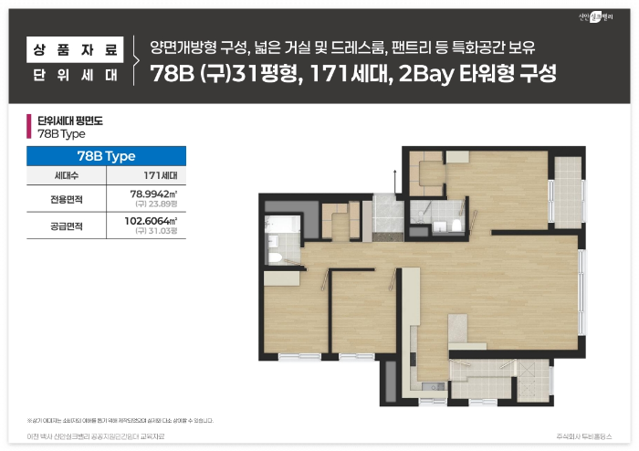 78A타입은 270세대로 드레스룸과 알파룸이 갖춰진 넉넉한 공간 구성이 장점이며, 전용면적 78.9971㎡에 공급면적 102.2338㎡입니다. 78B타입은 171세대로 2베이 타워형 구조로 거실과 드레스룸이 분리된 실용적 평면으로, 전용면적 78.9942㎡에 공급면적 102.6064㎡입니다. 84타입은 227세대로 5.1m 확장 거실과 대형 다용도실이 특징이며, 전용면적 84.9339㎡에 공급면적 109.7889㎡로 가장 넓은 평형입니다.