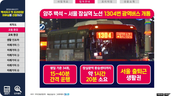 교통 여건도 꽤 괜찮은 편입니다. 국도 98번, 3번, 39번을 통해 의정부, 동두천, 서울로의 이동이 가능하며, 양주 서부 최초 광역노선인 백석에서 잠실까지 연결되는 광역버스를 이용하면 서울 강남 도심까지 환승 없이 이동할 수 있습니다. 단지 앞 버스정류장에서 13개 이상의 노선을 이용할 수 있다는 점도 대중교통 접근성 측면에서 긍정적입니다. 또한 양주시 복지지구 개발에 따라 양주산성로가 4차선으로 확장될 예정이어서 교통 흐름도 개선될 전망입니다.