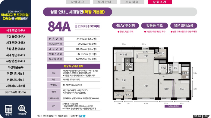 단지 설계를 살펴보면 실용성에 상당히 신경 쓴 흔적이 보입니다. 전 세대 남향 위주 배치와 5베이 판상형 설계를 통해 채광과 통풍을 극대화했고요. 전용면적 84제곱미터 단일 평형으로 구성되어 있어 최근 주거 트렌드에 맞춰 적당한 크기를 선호하는 수요층을 겨냥했습니다. 또한 알파룸과 드레스룸, 팬트리 등 수납공간을 넉넉하게 확보했으며, 주차장을 지하로 배치하고 지상에는 중앙광장과 어린이놀이터 등을 조성한 공원형 아파트로 설계되었습니다.