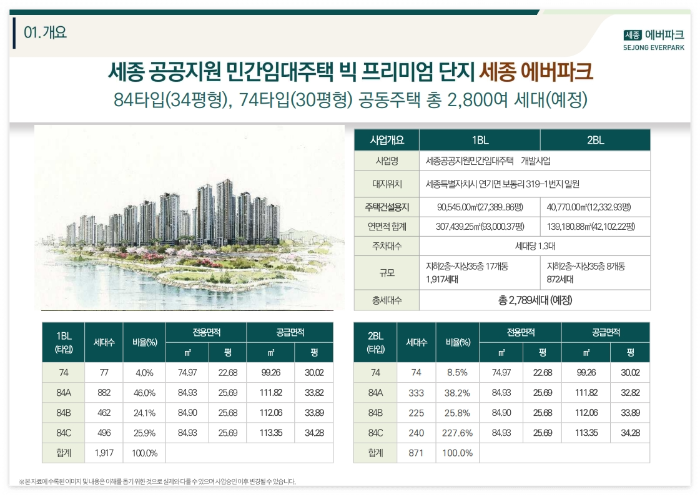 세종 보통리 에버파크는 연기면 보통리 일원 약 23만 3,086㎡ 부지에 들어서는 대단지 아파트로, 총 2,789세대 규모입니다. 1블록은 지하 2층, 지상 2035층 규모로 17개 동 1,917세대가, 2블록은 지하 2층, 지상 2325층 규모로 8개 동 872세대가 들어서며, 전용면적 74㎡와 84㎡ 두 가지 타입으로 구성됩니다. 이 단지의 가장 큰 특징은 공공지원 민간임대주택이라는 점인데, 10년간 임대로 거주한 후 사업승인 시 확정된 분양가로 전환할 수 있어 집값 상승 부담은 덜면서도 미래가치는 선점할 수 있다는 장점이 있습니다.