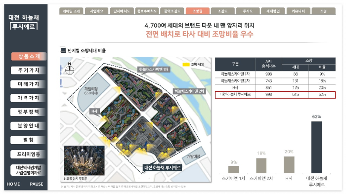 위치적으로 대전 하늘채 루시에르 2차가 주목받는 이유는 선화동 초고층 브랜드 타운 중에서도 가장 앞자리에 자리 잡고 있다는 점입니다. 뒷동이 아닌 전면 배치로 탁 트인 조망권을 확보했고, 대전 원도심의 스카이라인을 바꾸는 랜드마크로 자리매김할 것으로 전망됩니다. 실제로 최고 49층 높이에서 바라보는 대전 시내 전경은 이 지역에서 누릴 수 있는 특별한 프리미엄이라 할 수 있겠죠. 루시에르라는 단지명 자체도 스페인어로 빛나다를 의미하는 Lucir와 하늘·창공을 뜻하는 éter의 합성어로, 대전 시민들의 직접 투표를 통해 선정되었다고 합니다.