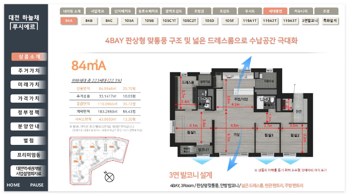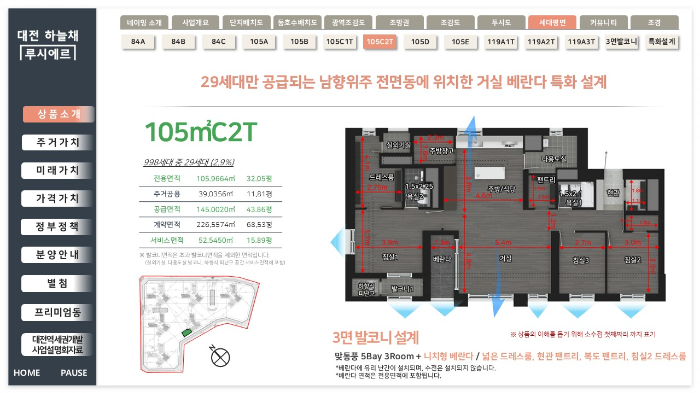 주거 설계 측면에서 대전 하늘채 루시에르 2차는 4세대 주상복합 아파트의 장점을 충실히 반영했습니다. 전 세대에 2.4m의 높은 천장고를 적용해 개방감을 극대화했고, 타입별로 3면 발코니 설계를 도입해 공간 활용성과 채광을 높였습니다. 층간소음 완충재 시공으로 층간소음 걱정을 줄였으며, 드레스룸과 현관·주방 팬트리를 구성해 수납공간도 넉넉하게 확보했습니다. 커뮤니티 시설로는 스카이라운지, 무비살롱, 퍼스널 스파 같은 특화 시설부터 피트니스센터, 사우나, GX룸, 골프연습장, 실내체육관, 게스트하우스까지 다양하게 갖춰져 있어 입주민들의 삶의 질을 한층 높여줄 것으로 기대됩니다.