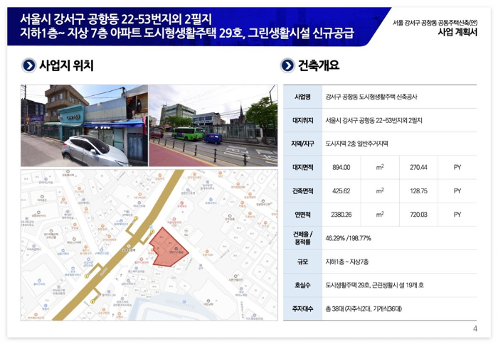 트레비움 마곡시티는 서울 강서구 공항동 일원에 조성되는 도시형생활주택과 근린생활시설 복합 구성의 소형 주거 상품입니다. 공식 사업개요 기준으로 건물은 지하 1층부터 지상 7층 규모이며, 도시형생활주택 29세대와 근린생활시설 19실로 구성됩니다. 대지면적은 894.00㎡, 연면적은 합계 2,380.26㎡로 안내되어 있고, 건폐율 46.29%, 용적률 198.77%가 제시됩니다. 또한 지역지구는 도시지역, 제2종일반주거지역, 제1종지구단위계획구역으로 표기되어 있어, 주거 기능을 중심으로 생활 편의 요소가 결합되는 형태로 이해하는 것이 자연스럽습니다.