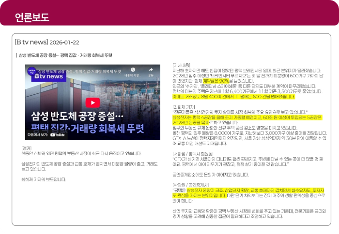 평택과 비슷한 위치에 있던 화성 동탄, 수원 광교의 과거를 되짚어볼 필요가 있습니다. 두 지역 모두 삼성 사업장 인근이라는 공통분모를 갖고 있었고, 최근 5년간 아파트 시세가 20퍼센트 이상 상승했습니다. 반면 평택은 같은 기간 3.3퍼센트 상승에 그쳤습니다. 이 격차를 시장 침체로만 해석할 것인지, 아니면 평택의 저평가 국면으로 볼 것인지는 관점의 차이겠지만, 삼성전자 평택캠퍼스 추가 투자가 이어지는 상황에서 경부선 산업 축의 가능성은 여전히 존재합니다.