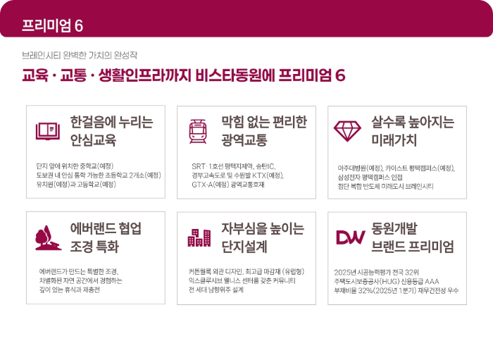 조경 부문에서는 삼성물산 리조트 부문 브랜드 에버스케이프가 설계를 담당합니다. 왕벚나무, 느티나무, 단풍나무로 구성된 테마 숲과 바닥분수, 연못 등 수경시설이 단지 전체에 배치됩니다. 평택 브레인시티 비스타동원 내부에는 티하우스, 맘스스테이션 같은 휴게공간도 마련되고, 지역 최대 규모 다목적 체육관, 피트니스센터, 골프연습장, 실내 테니스장을 갖춘 웰니스센터가 들어섭니다. 에버랜드의 조경 운영 노하우가 반영된다는 점에서 완성도를 기대할 수 있습니다.